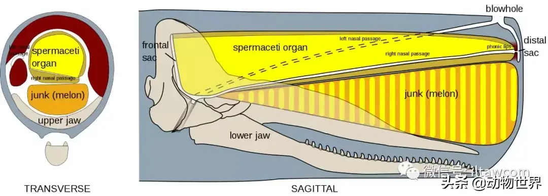 与身躯比较,抹香鲸的头部显得不成比例的重而大,而尾部却显的短小,这使得抹香鲸的身躯比例则头重尾轻。