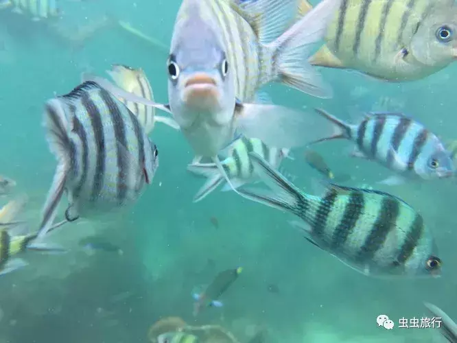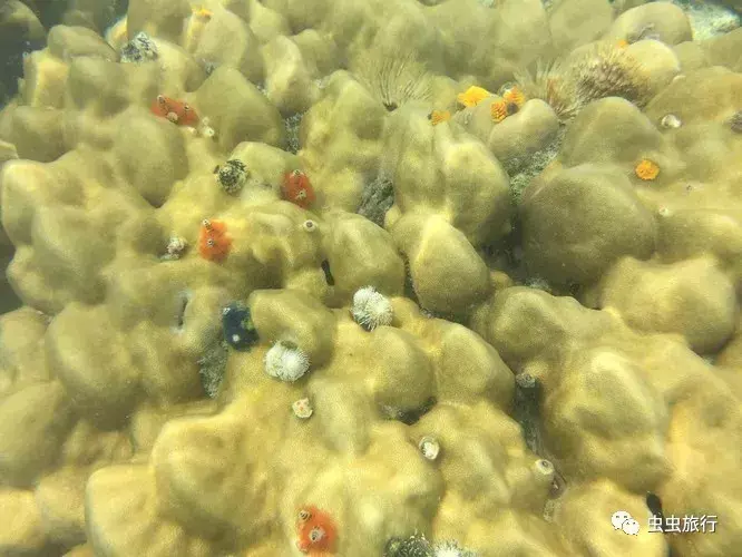 下雨导致海水浑浊,不过还是清晰可见水下的珊瑚和海鱼。