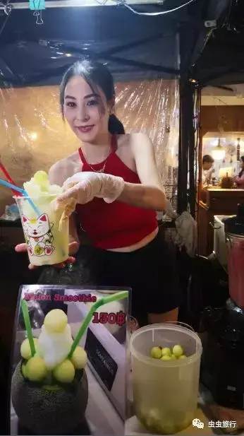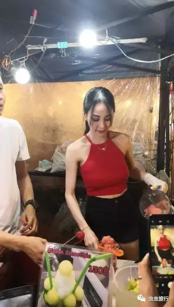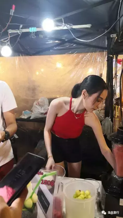 水果西施的职业素养非常好,每晚都打扮得漂漂亮亮的,肤白唇红,身段窈窕,又做水果又配合游客拍照,虽然她的果汁要比其他摊位的贵,可还是挡不住人潮滚滚!