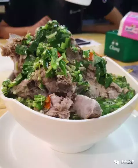 其实就是猪脊椎骨清汤煲熟,一层层架起来,再洒上大芫荽小米辣等香菜调料,状似火山,口感和云南人喜欢的排骨炖汤打小米辣蘸水差不多。