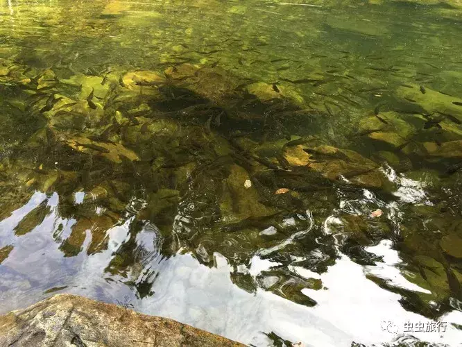 孔抛瀑布潭水清澈悠凉,游鱼冉冉,置身于水中,被很多小鱼团团围绕,轻轻啄咬,甚是有趣!与鱼疗有着异曲同工之妙。