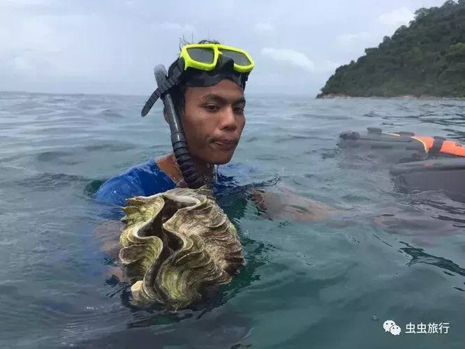 船员个个都是自由潜好手,下水钓鱼捞螺,这一个大海贝很象砗磲哦……捞出水面的时候还滋滋喷水,不过我们都是看看就还回大海了。