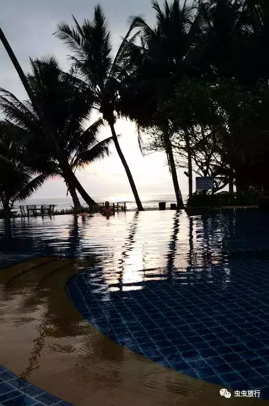酒店餐厅在海滩边,可以边用餐边欣赏海景,隔壁是泳池,正值傍晚时分,俩老外泡水里观赏日落。