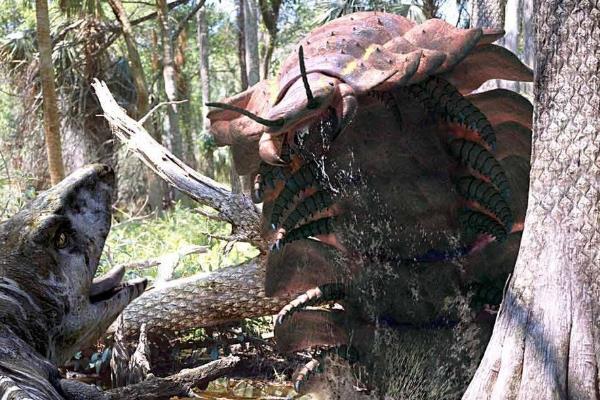 旷古蜈蚣是一种出生于三亿年前石炭纪的虫豸,本质上瞅起来便像是一般蜈蚣的搁大版,完全长度可达3米,几乎是一般蜈蚣体长的数百倍,因此它在其时几乎是不对于手的,而且它不只长相恐惧,也和一般蜈蚣一般具有着热烈的毒性,更加是在碰到进犯的时间,这种毒液会引导猎物涌现皮肤腐败的症候,极为猛烈。
