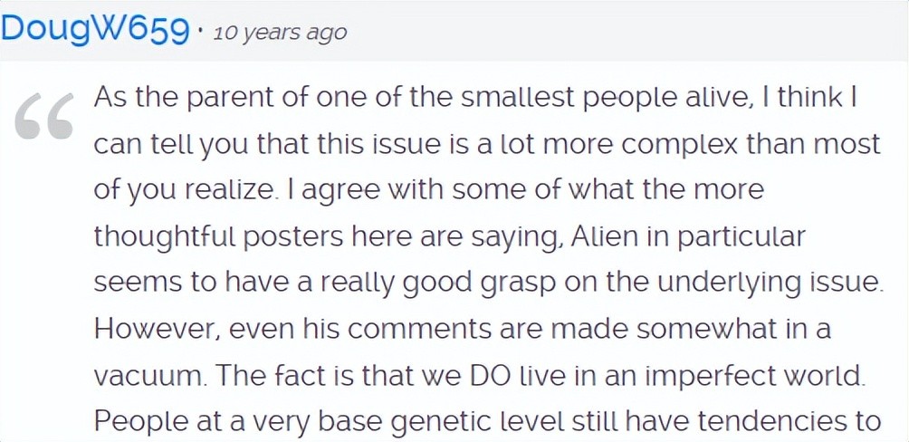 外国的一位儿子患有着侏儒症的母亲,曾在看到这个主题乐园的报道时留言。她表示,这个问题其实比我们大多数人意识到的要复杂得多。她同意这里一些更深思熟虑的权利保护者们所说的话。但是,她觉得他们的发言都有点太“空”了。
