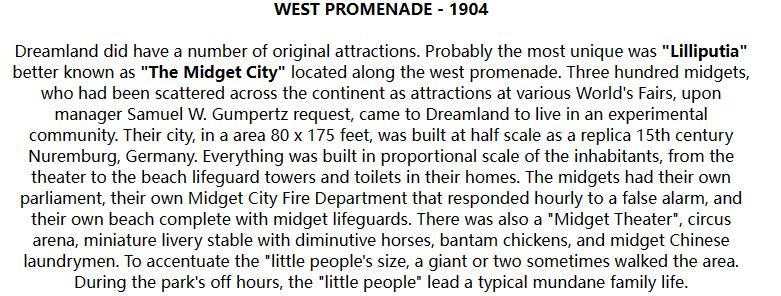1904年,康尼岛上曾创建了一个“小人国乐园”,供 300 名小人居住。但与此同时,抱着好奇、目瞪口呆以及猎奇心理的游客在他们的中间徘徊。一百多年后的2009年,一个类似的游乐园在云南省的省会昆明开业。