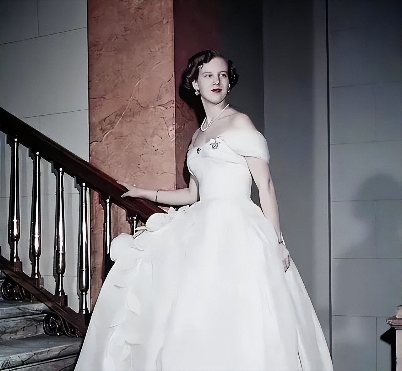 经过两年的相处,1967年玛格丽特二世和亨里克大婚,他们站上了丹麦王室的阳台,玛格丽特二世头顶皇冠,穿一身款式简约保守的白色蕾丝婚纱,头戴珍珠耳环,朝着阳台下面,挥舞着手上的美丽花束,想要向全世界分享自己这美丽的爱情。