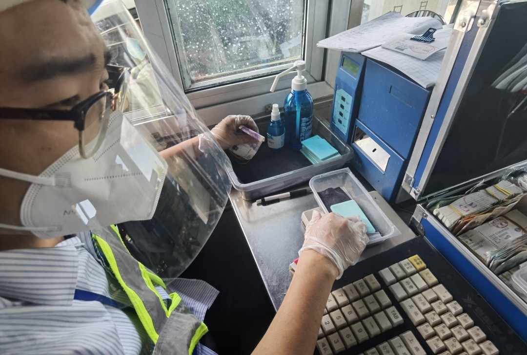 收费员做好CPC通行卡的消毒工作/记者拍摄