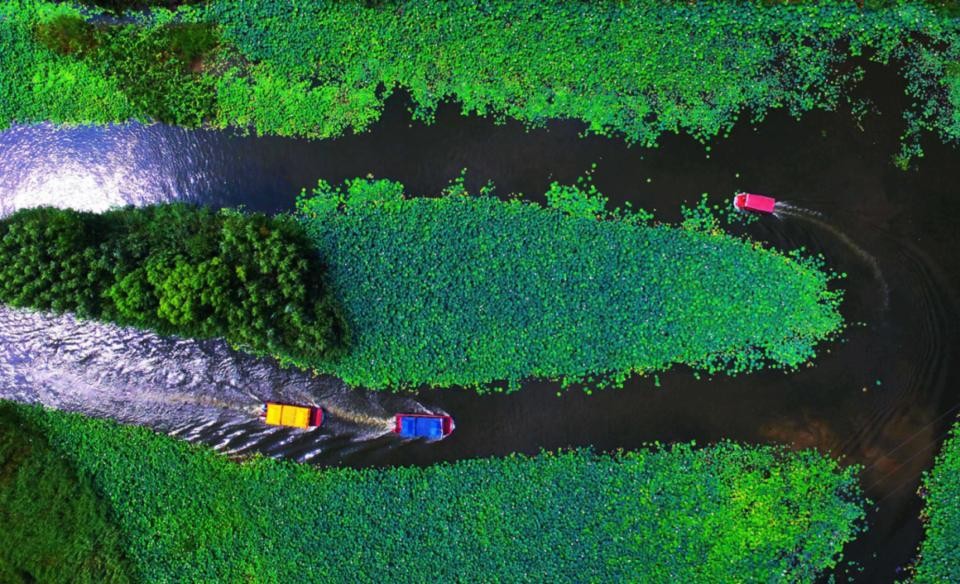 微山湖国家湿地公园位于山东省济宁市微山县南部,以微山湖湿地生态系统和历史文化为主要资源,以湿地保护、科普教育、水质净化、生态观光为主要内容,集生态、自然、观光于一体,是亚洲保存最完好、最大的草甸型湖泊湿地,荣获“亚洲第一湿地”“中国十大魅力湿地”“国家生态示范区”等称号,济宁因此列入国际湿地城市目录。在刚刚结束的第三十届微山湖荷花节暨湿地嘉年华活动,千架无人机在湿地公园上演“天空盛宴”,秀出了微山之美!