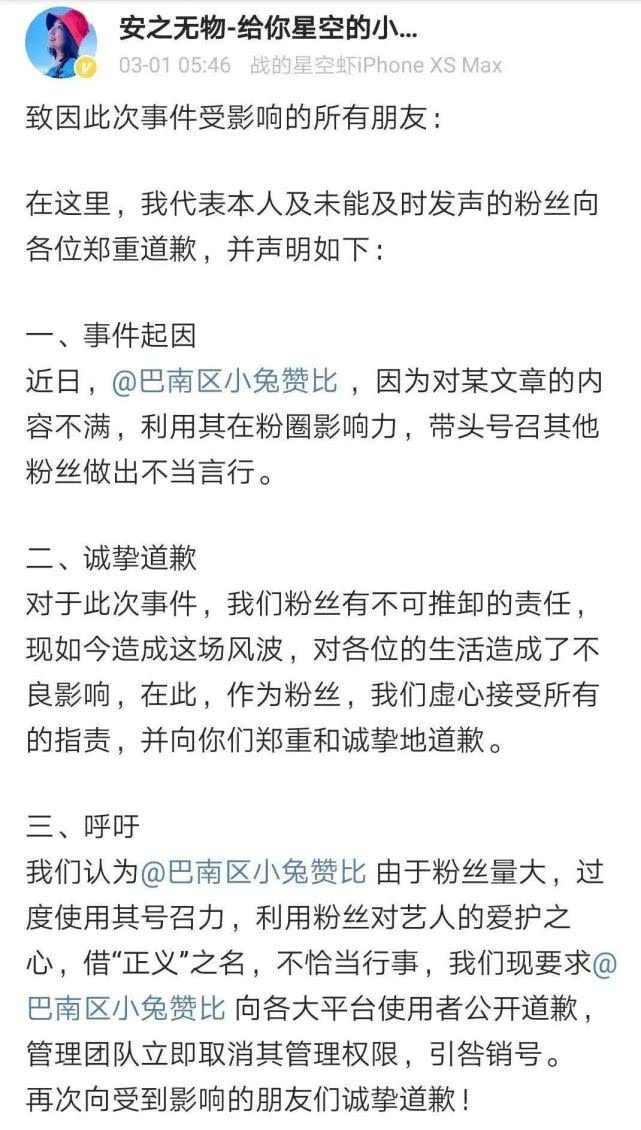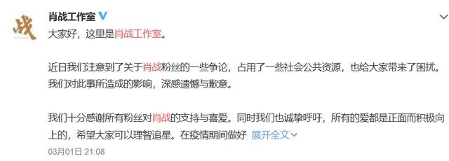 三月一日晚上九点冷处理三天的肖战工作室姗姗来迟,发表了道歉声明
