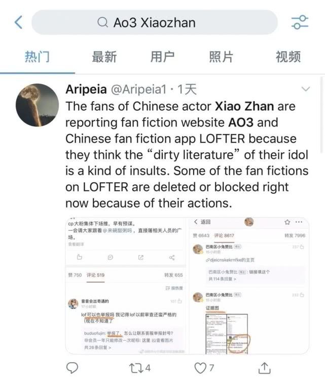 并且唯粉还指出Lofter(国内最大的同人创作社区app)与Ao3(一家为同人创作提供服务器的国外网站)在其中的的作用,并号召肖战粉丝们向有关部门举报