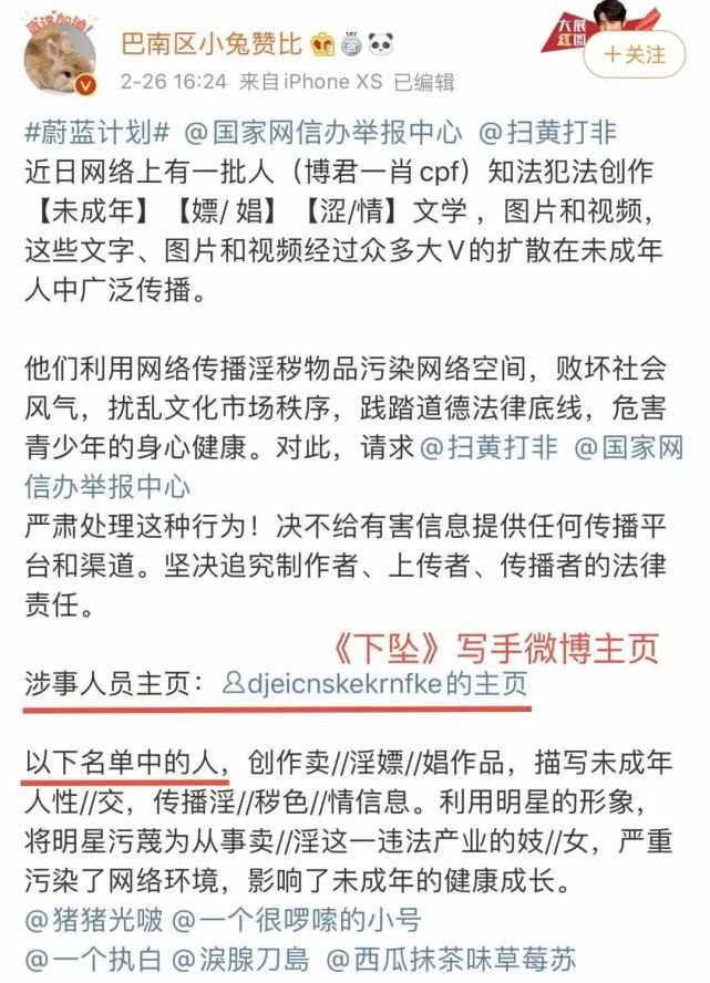 2月26日下午18时05分,肖战唯粉@来碗甜粥吗和@巴南区小兔赞比首先对同人文《下坠》及其作者攻击