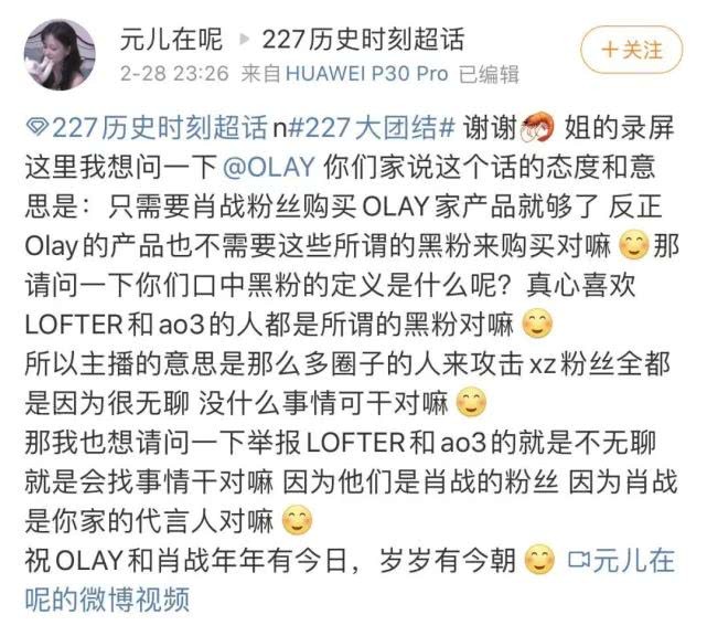 227团找到了新的突破点:”打击“肖战的商务代言,以补开发票的形式狙击OLAY,并号召路人不再购买肖战代言的产品