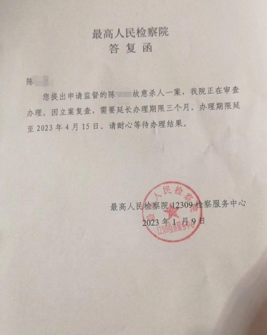 陈某某认为,案件疑点很多,应重新审理。江苏法德东恒律师事务所律师蓝天彬和韩磊代理该案申诉多年,多次向最高人民法院和最高人民检察院申诉,希望重新审理此案。2025 年 1 月 9 日,最高人民检察院给予了答复:" 您提出申请监督的陈某某故意杀人一案,我院正在审查办理。因立案复查,需要延长办理期限三个月。办理期限延至 2025 年 4 月 15 日。"