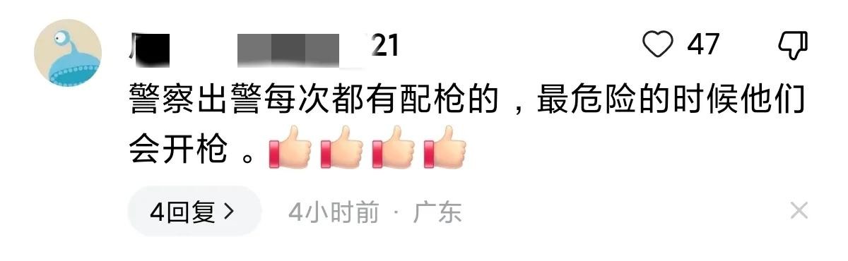 一位广东的网友表示,警察出警每次都有配枪的,最危险的时候他们会开枪。