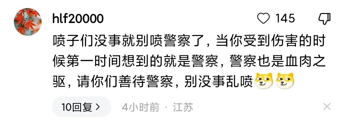 一位江苏的网友称,喷子们没事就别喷警察了,当你受到伤害的时候第一时间想到的就是警察,警察也是血肉之躯,请你们善待警察,别没事乱喷。