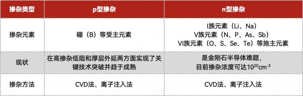 第二,金刚石芯片掺杂存在瓶颈。纯净的金刚石本身是一种绝缘体,只有掺杂才能变成半导体。目前,金刚石芯片 p 型掺杂较为成熟,主要以硼(B)掺杂为主,而 n 型掺杂则是产业化的难题,n 型掺杂元素在金刚石中具有高电离能,很难找到合适的施主元素,目前学界和工业界众说纷纭,当然也逐渐有了进展。