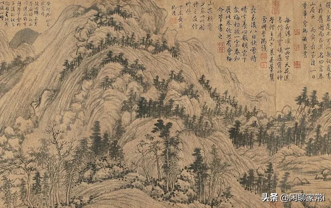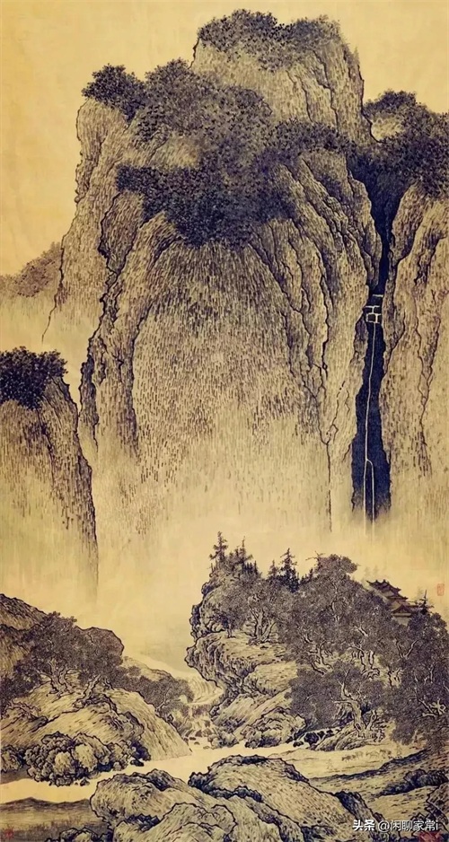 《溪山行旅图》被誉为宋画第一,这幅画大部分时间都藏于深宫,直到解放前夕才被运往台北收藏。宋代著名“北派”山水画大师范宽作品。画中巨峰壁立,几乎占满了画面,飞瀑从山腰间直流而下,山脚下巨石纵横,画面体势错综。