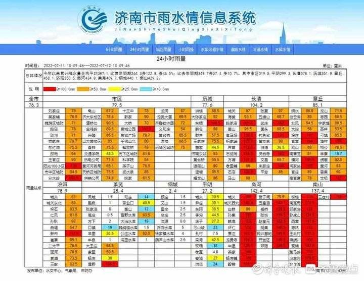 济南市雨水情信息系统显示,济南市区24小时平均降雨量为79.5毫米,历城24小时平均降雨量为77.6毫米,长清24小时平均降雨量为104.2毫米,章丘24小时平均降雨量为85.1毫米,济阳24小时平均降雨量为78.9毫米,南山24小时平均降雨量为137.4毫米,商河24小时平均降雨量为142.4毫米,这些地方24小时平均降雨量均达到了暴雨级别。