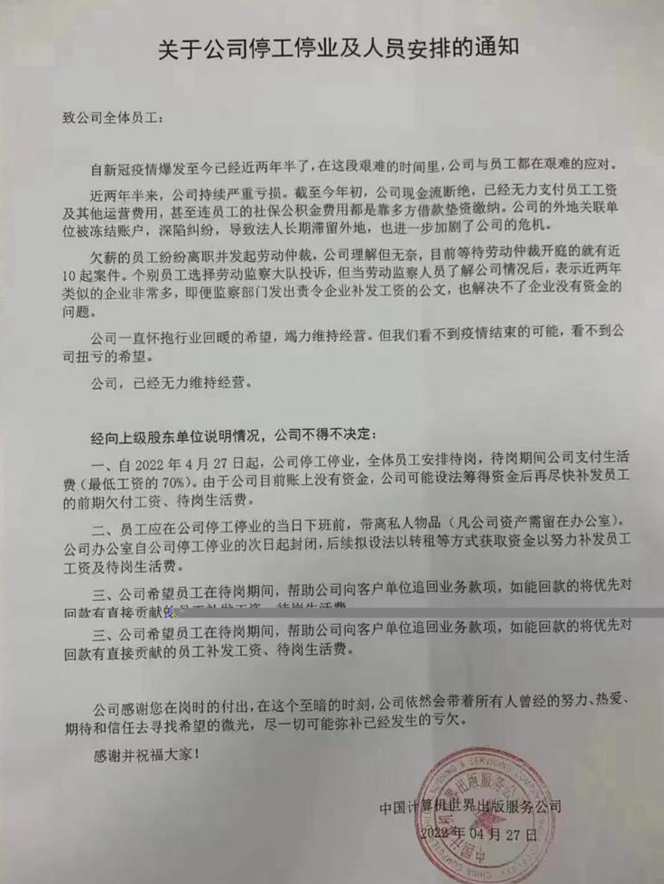 4月27日,中国计算机世界出版社服务公司(计算机世界品牌拥有方,以下称计算机世界)发布停工停业通知,通知中称,自新冠疫情爆发至今,公司持续严重亏损,现金流为零,连员工社保都是借钱交的。