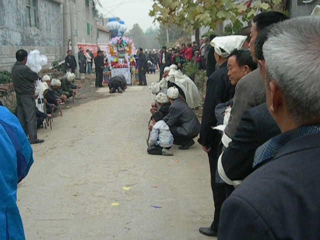 丧葬行进中,至亲在半路准备瓜果跟随队伍至坟地。在农村,路祭是丧葬过程中的一个重要仪式。当行进队伍将要出村时,亲朋好友会用老人最后一程,这时也将按吊孝的礼仪,孝子跪坐两侧,亲友行礼。若逝者为女性,则逝者娘家人会跟随队伍送。路祭体现了亲友对逝者的敬重和送别之情。
