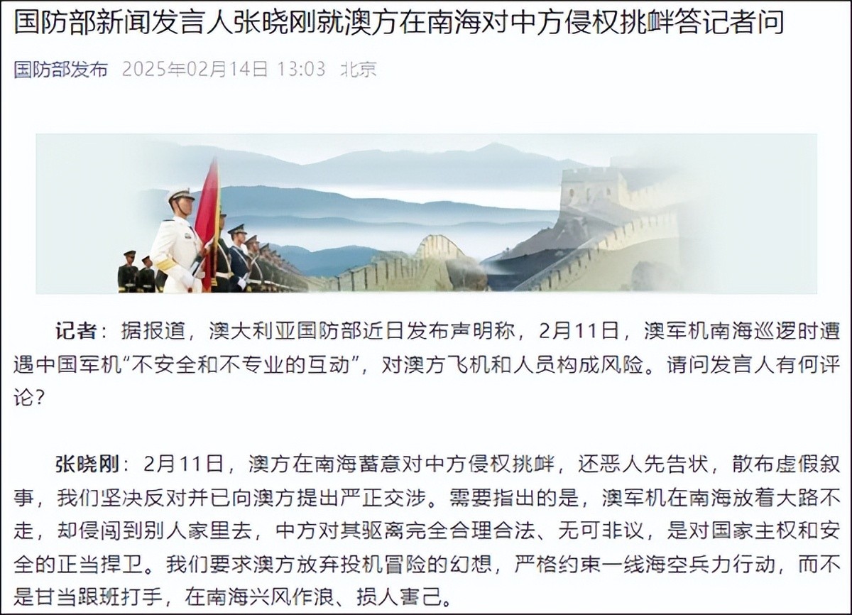 还是这个马尔斯,在2月早些时候,澳大利亚空军的一架美制P-8A反潜机,因为犯贱跑到南海来替美国军方火中取栗,结果被我们前出执行伴飞拦截任务的战斗机打了一发照明弹吓跑了,马尔斯在当时挺为这事感到委屈的,一边护着自家那几个不成器的犊子,一边还蛐蛐我们,说什么“中方在南海进行了‘不安全’‘不专业’的互动”。
