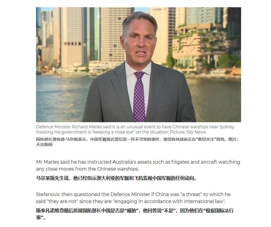 “中国军舰如此靠近悉尼的确是一件非同寻常的事情,堪培拉当局正在‘密切关注’局势的进展,澳方已经派出了军舰和飞机对中国军舰进行监视,我们将确保全程跟踪,尽在掌握,还请广大澳大利亚民众和西方友邦不要惊诧。”