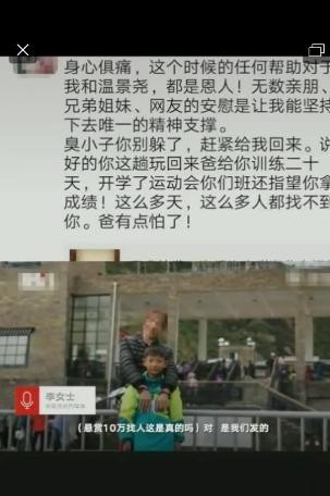 “臭小子你别躲了,赶紧给我回来。说好的你这趟玩回来爸给你训练二十天,开学了运动会你们班还指望你拿成绩!这么多天,这么多人都找不到你。爸有点怕了!”------转自温景尧父亲朋友圈