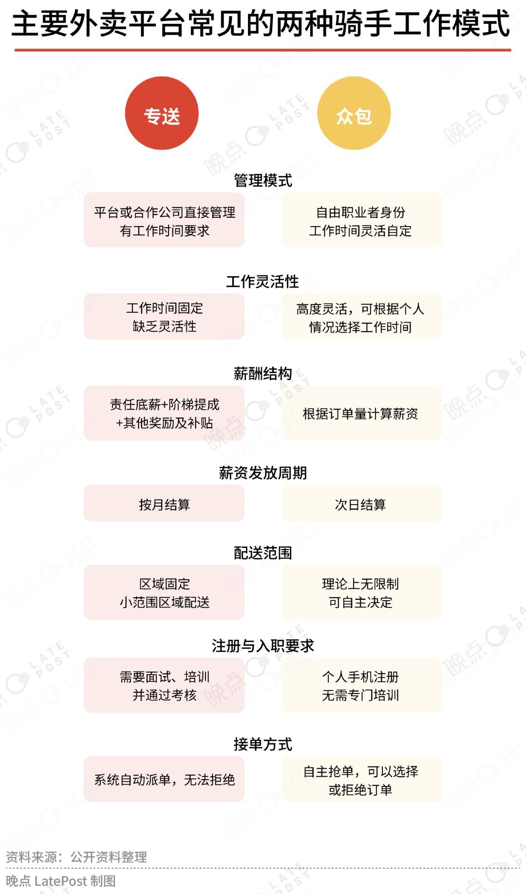 外卖平台根据工作属性,将骑手主要分为专送、众包两类。