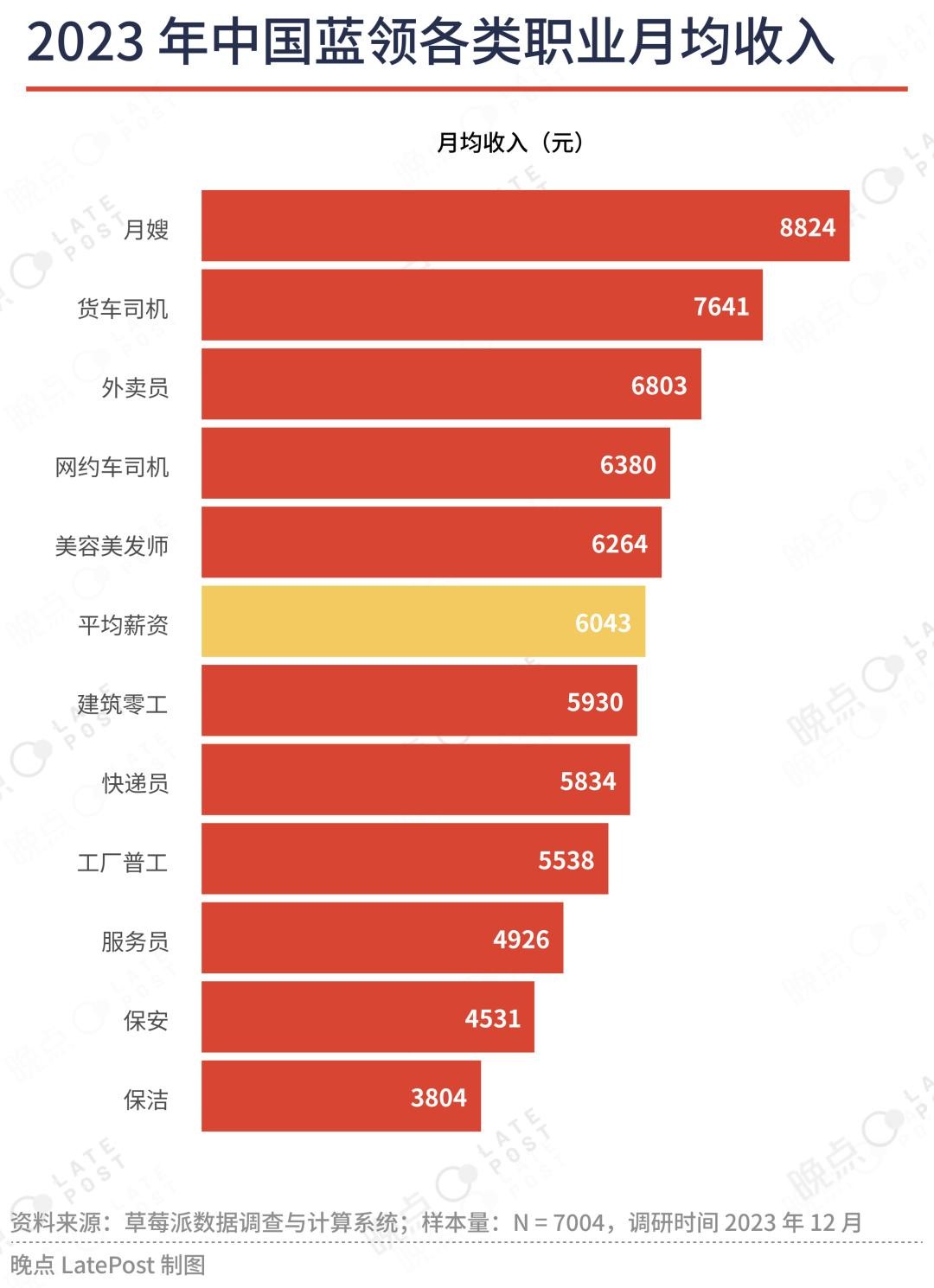 根据草莓派数据 2023 年对 7004 名蓝领劳动者的收入的调查显示,外卖员的平均薪资高于网约车司机、建筑零工、快递员、工厂普工、保安、保洁等职业。
