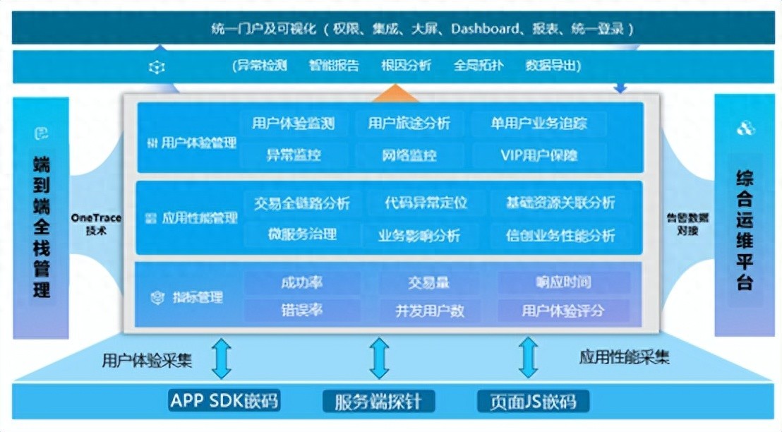 针对省联社各类应用系统,实时采集性能数据,覆盖从用户端到后端数据库的全链路,支持对交易代码层面的精确分析。通过对性能数据的可视化展示,帮助运维团队快速识别性能瓶颈、交易异常等问题,并针对性进行优化。同时,通过OneTrace技术,实现与行内日志监控平台关联分析,在全链路定位问题时,可结合日志中详细的业务上下文信息,高效精准定位问题。
