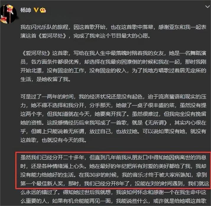 结果第二天,杨坤就现身道歉,表示自己喝酒是因为心情不好,并不是对工作不负责任,而影响心情的原因是,他得知自己的前女友因病离世,虽然分开了二十多年,但依旧非常想念,各种悲伤涌上心头,这才犯下喝酒这个“大忌”。