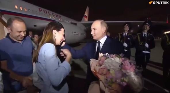 当地时间 8 月 1 日晚间,俄总统普京在 " 伏努科沃 -2" 机场的飞机舷梯旁,迎接了换囚行动中获释返俄的俄公民。