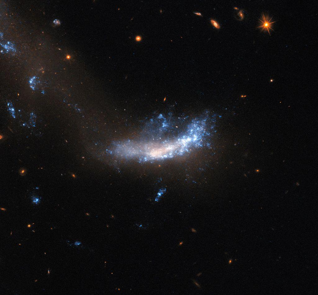 在哈勃传回的这张图片中,可以看到一个扁平、畸形的星系,右侧则是闪闪发光的气体和尘埃。