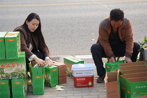 “24小时都有人下单。”每天上午七点,刘琳和丈夫就要起床忙活。店门口,用来装萝卜的空纸箱堆成小山。家里的老人也来帮忙,把一个个纸箱折成包装需要的形态。十几分钟的时间里,刘琳和丈夫不停的坐下、起身,频繁地出入店里店外。接到订单,刘琳和丈夫就停下手里折纸箱的活。他们按照订单要求,将萝卜装箱,填写快递单。