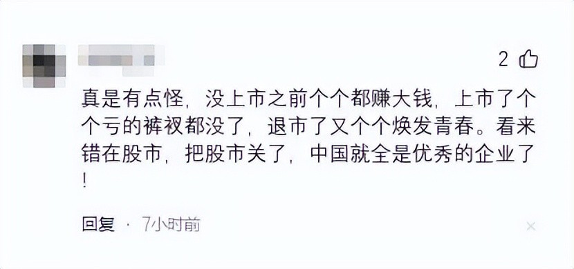 真是有点怪,没上市之前个个都赚大钱,上市了个个亏的裤衩都没了,退市了又个个焕发青春。看来错在股市,把股市关了,中国就全是优秀的企业了!