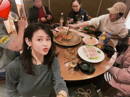 照片里是于明加和丈夫,还有父母家人一起围在桌子前面吃饭喝酒,其乐融融!