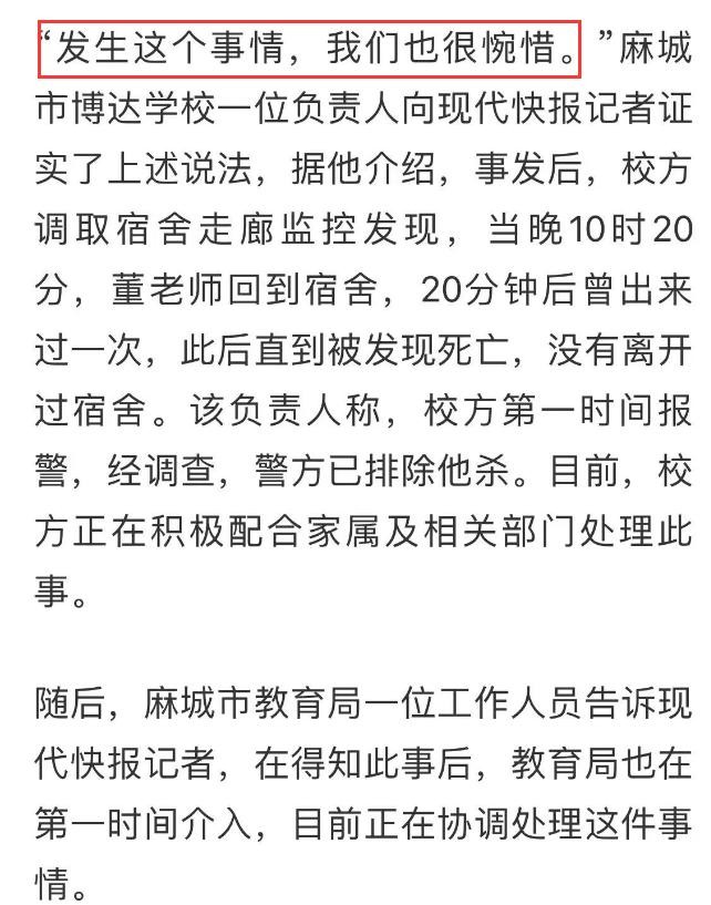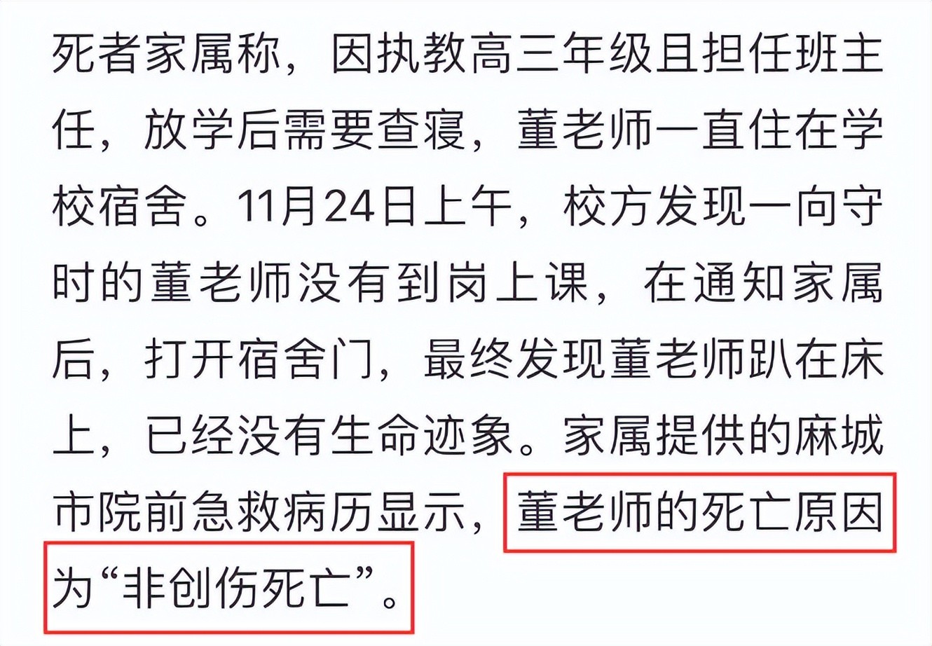 麻城市博达学校,一所响当当的私立学校,却成为了董老师生命的最后归宿。23日晚,董老师像往常一样查完寝,回到宿舍,次日却再也没有出现在教室里。他的尸体被发现时,早已冰凉,全身僵硬,口唇发紫,死亡的原因被记录为“非创伤死亡”。据家属描述,董老师生前常常感觉疲惫不堪,但为了不耽误学生的学习,他始终坚持在岗位上。