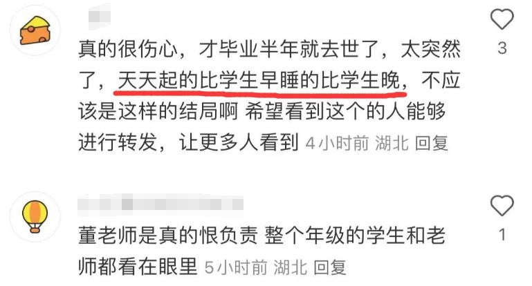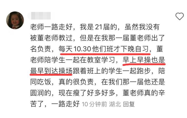 很多学生也为董老师发声,称他每天比学生起得早,睡得晚,是个出了名的负责老师。学生们的这些话,透着对老师的爱戴和敬意,但也透出了整个教育体系的压榨。董老师把自己当成了灯塔,却耗尽了油,他不仅是班主任,还是数学老师,负责两个班的数学教学,早已超出了正常的负荷。