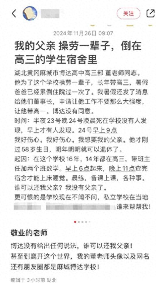 痛心!湖北58岁高三老师在宿舍去世,教育局介入,女儿发声曝细节