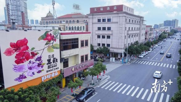 三角镇美丽示范主街五福路位于镇中心区。通过实施沿街建筑外立面美化、“三线”治理、市政设施优化、打造三角梅网红打卡点等举措,五福路沿线70栋房屋外立面得到清洗,增设126个空调外机外罩,美化约150个窗户,整治沿街32块招牌,增设701个电动自行车停车位等设施,路上还增加了自主设计的生鱼lP卡通造型等元素,成为颜值靓丽、富有活力的街区。