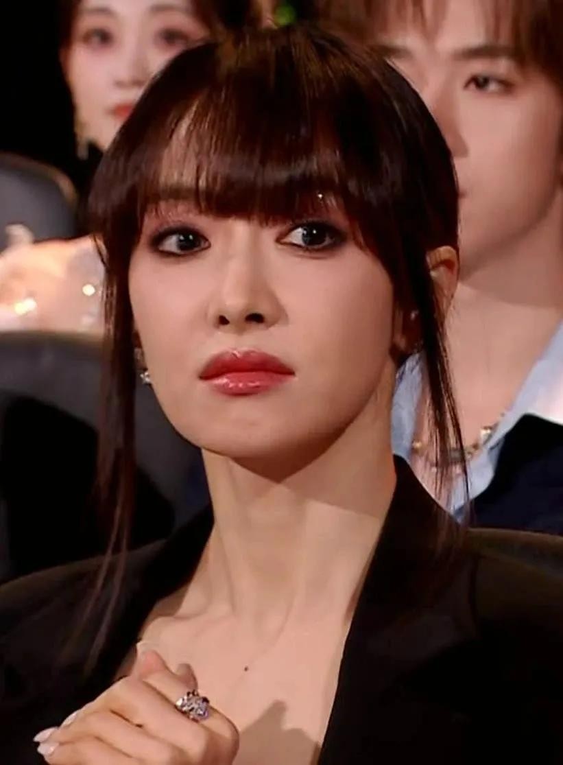 宋茜的妆容非常独特,齐刘海和烟熏妆的搭配让她的五官更加立体和深邃,让人眼前一亮。然而,猛一看还以为是宋慧乔来了,感觉有点撞脸了。