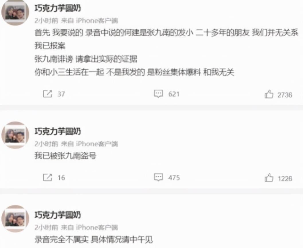 之后,张九南妻子又发了一条说是张九南盗取了她的账号发的,录音也是假的。