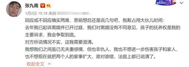 在声明的最后,张九南表示即便两个人不是夫妻,但也不是仇人。张九南不想进一步在网络上公布这件事情,伤害孩子和家人,所以简略回应一下。