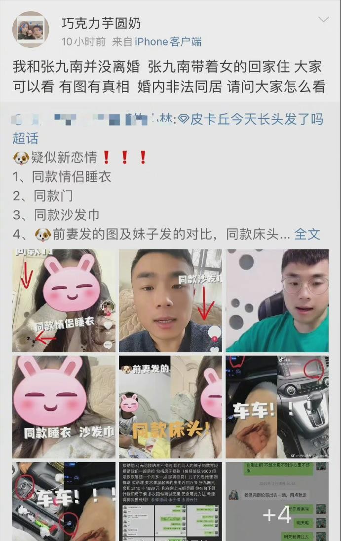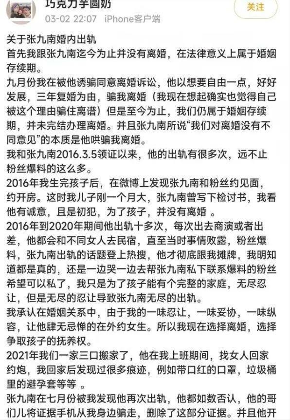 早在之前,张九南的妻子就在社交媒体平台上公开发文,控诉张九南出轨。