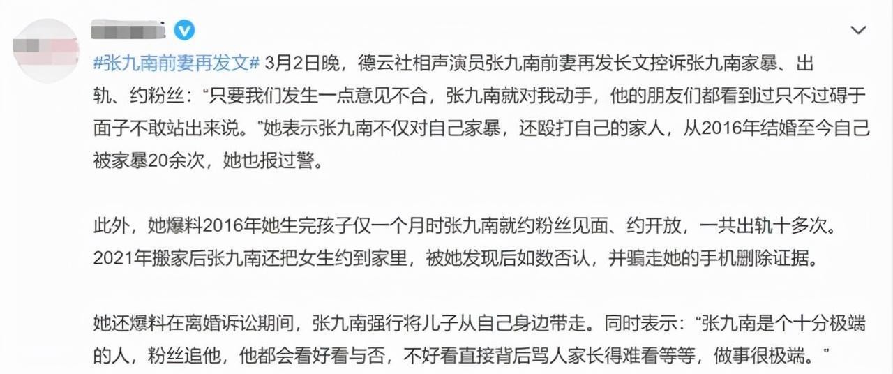 张九南又翻车?文章可见,长期以来张九南借着演出的机会,在外面出轨约炮,甚至回到家之后还要家暴她。