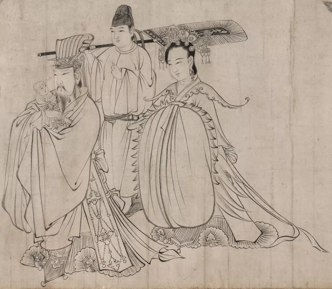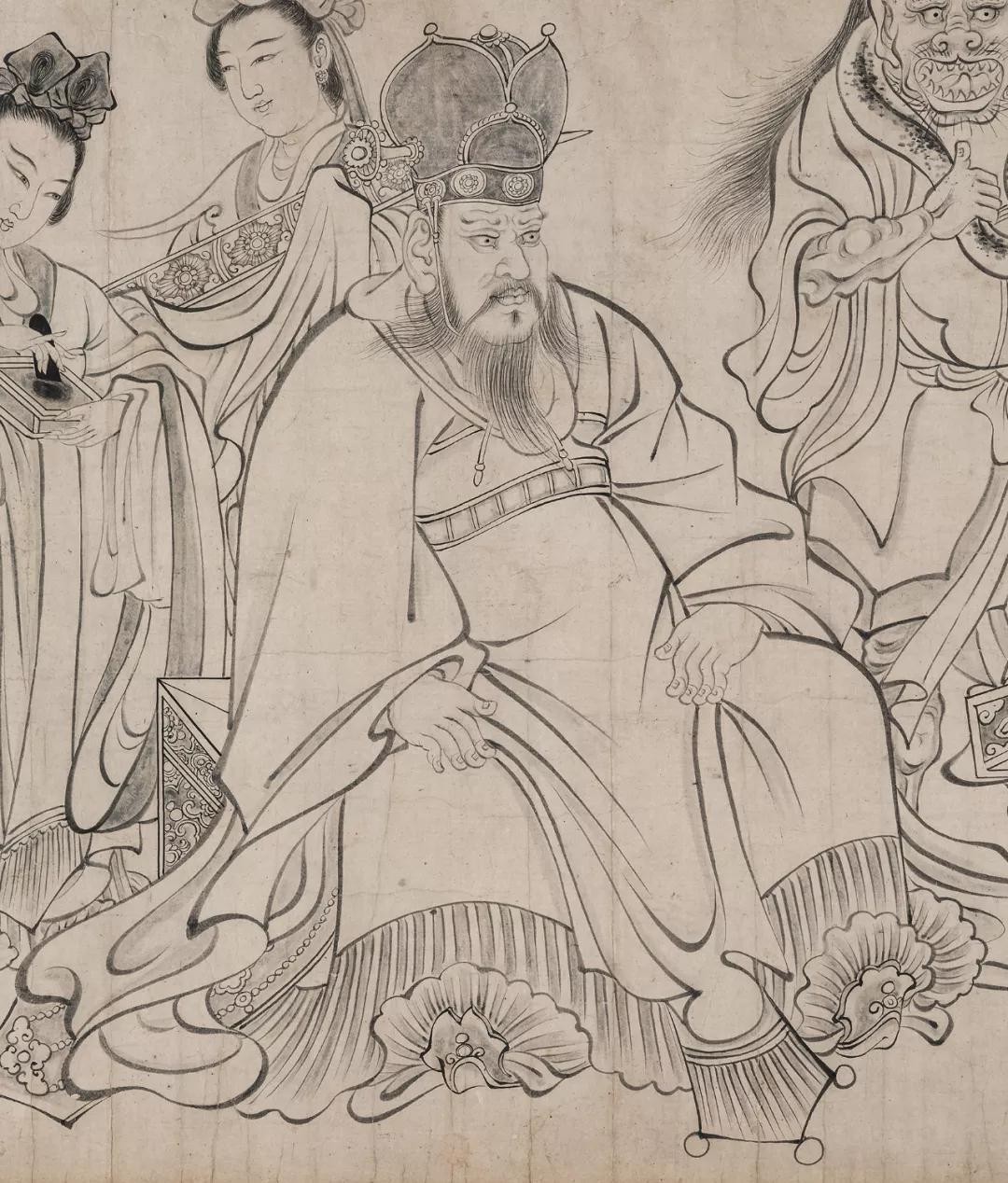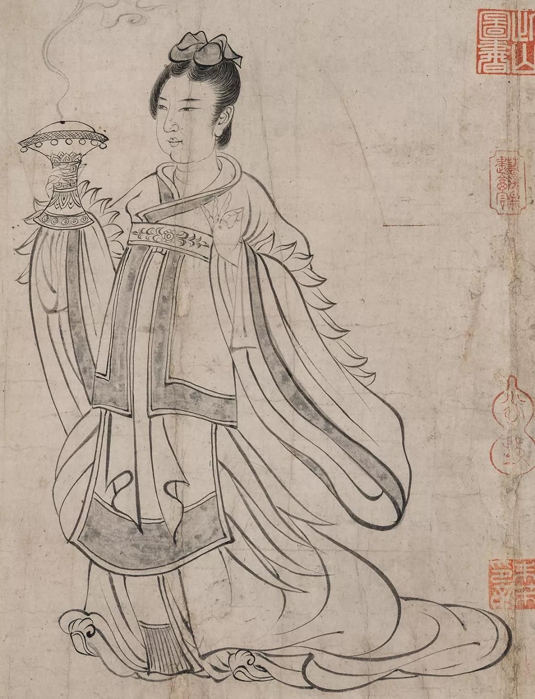 这张现存于日本大阪市立美术馆的《送子天王图》,可以说是吴道子绘画遗存里,年代最早、水平最高的作品。我们不妨先来欣赏一下这件笔法精妙、精美天伦的作品。此画装帧形式为手卷,纸本白描,画心尺寸纵35.7厘米,横338厘米。