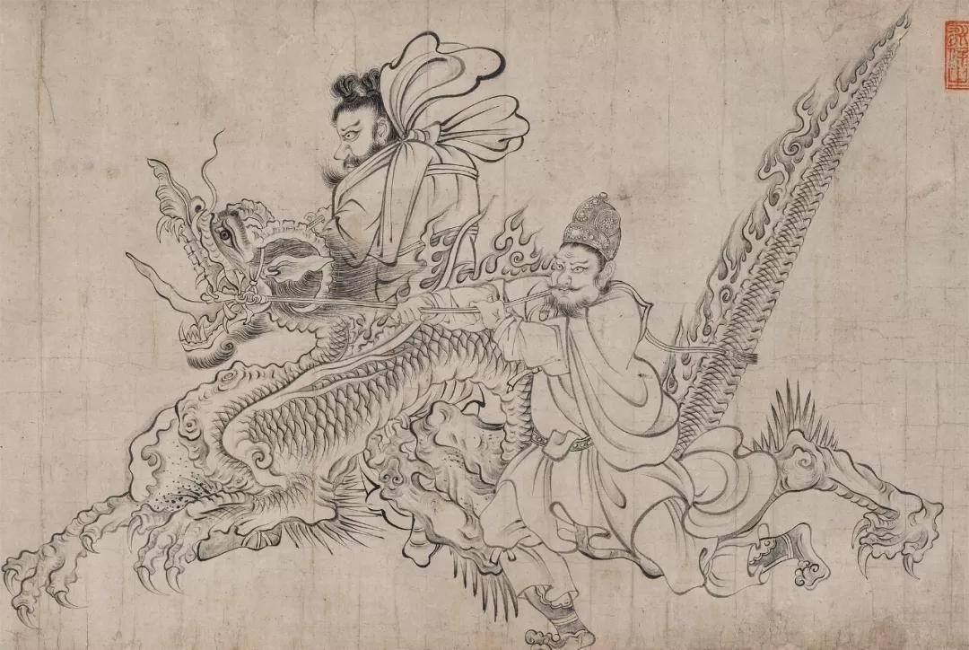 关于《送子天王图》的最早记录出现在明代书画收藏家张丑的《清河书画舫》中,张丑赞曰:“吴道子《送子天王图》,纸本,水墨真迹,是韩氏(存良)名画第一,亦天下名画第一。”表明其天下第一的地位。又据茅锥《南阳名画表》:“宋高宗乾卦绍兴小玺,贾似道封字长印,曹仲玄、李伯时、王谦等跋,是吴真迹。”可知,此亦是一件流传有序的传世名作。