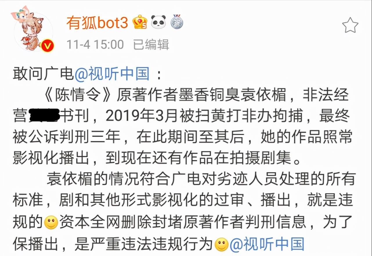 墨香铜臭翻车后,有一位网红接连发文,要求广电下架《陈情令》。理由是原作者墨香铜臭违法犯罪,所以她的作品影视化之后不能得到正常审核,并且下架是必须的。