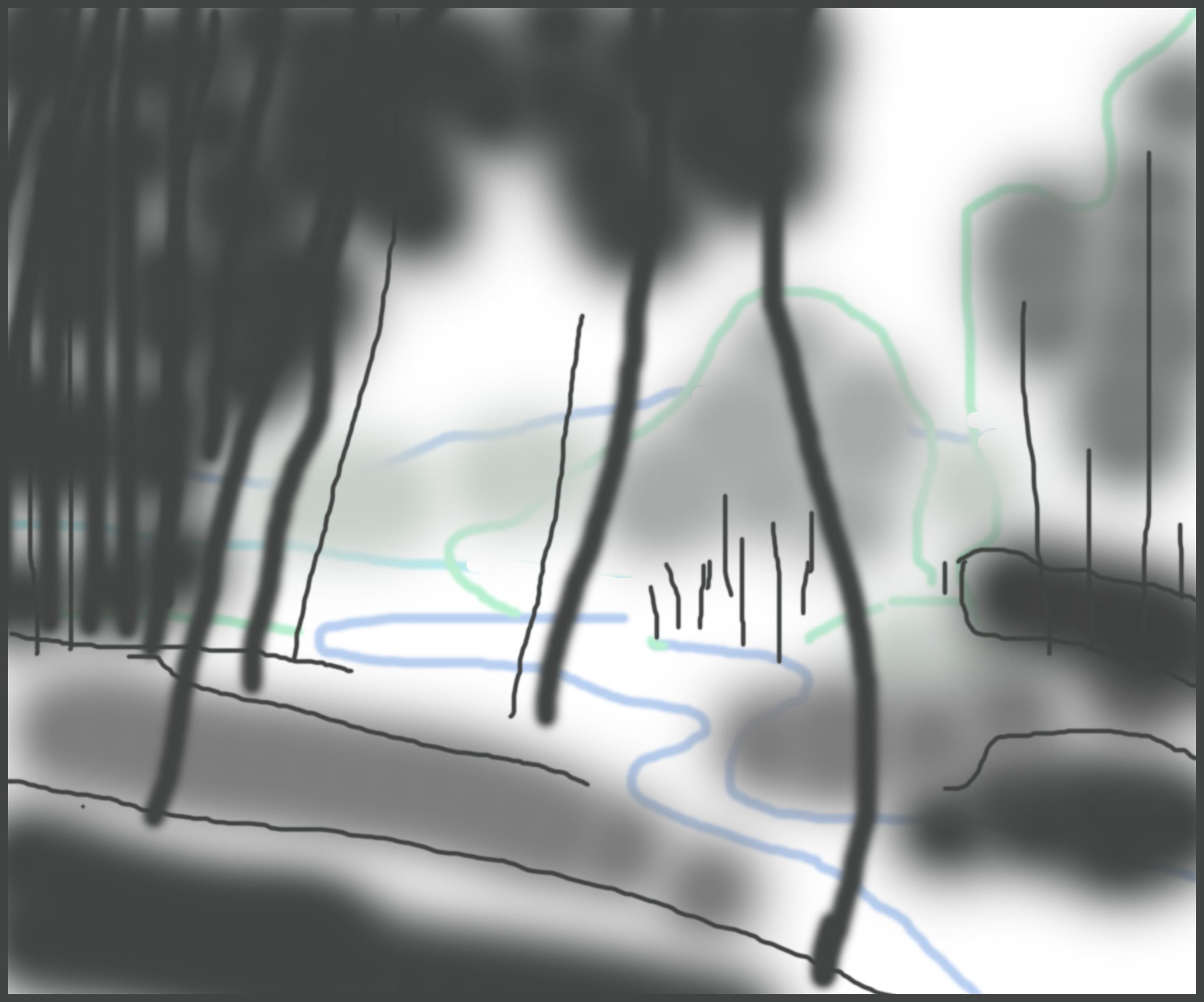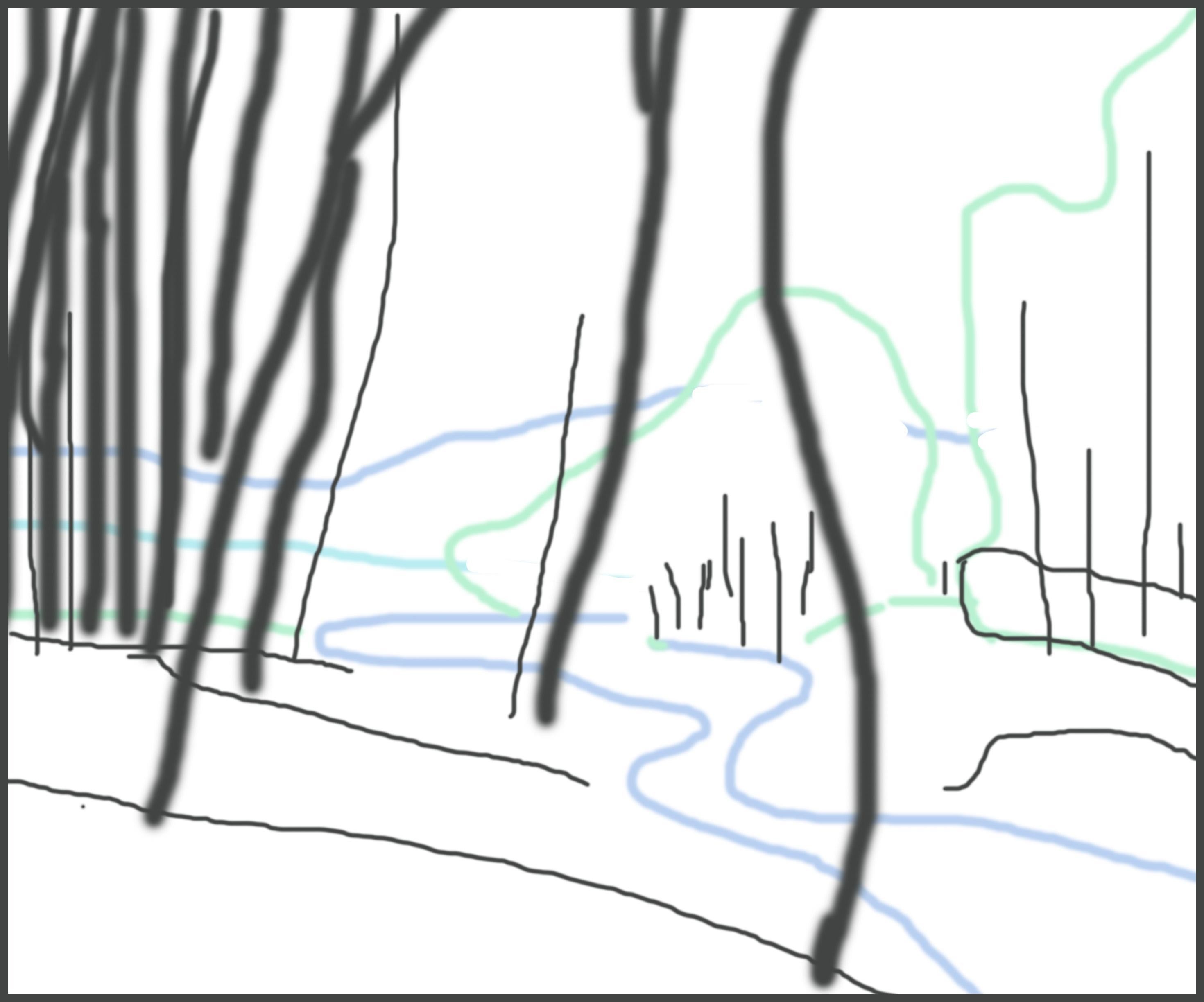 主体:小湖和湖边的树作为本幅画的主体物,比较合适。也就是说,这幅画我计划围绕远处的小湖来画。(图二)
